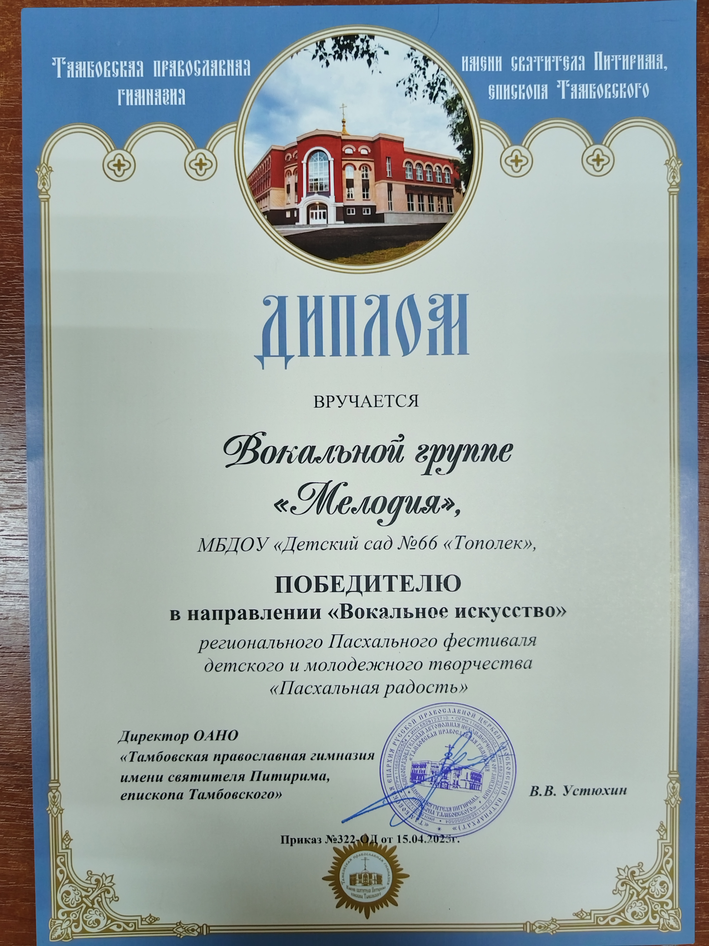 Сегодня 28.04.2025 состоялось награждение победителей и лауреатов Пасхального фестиваля "Пасхальная радость", который прошёл в Тамбовской православной гимназии имени святителя Питирима, епископа Тамбовского.Наши воспитанницы соединились в вокальный коллектив "Мелодия" и выступили с композицией "Пасха нынче к нам пришла".Мы получили диплом ПОБЕДИТЕЛЯ! Поздравляем девочек и музыкального руководителя Лютикову Марину Борисовну!
